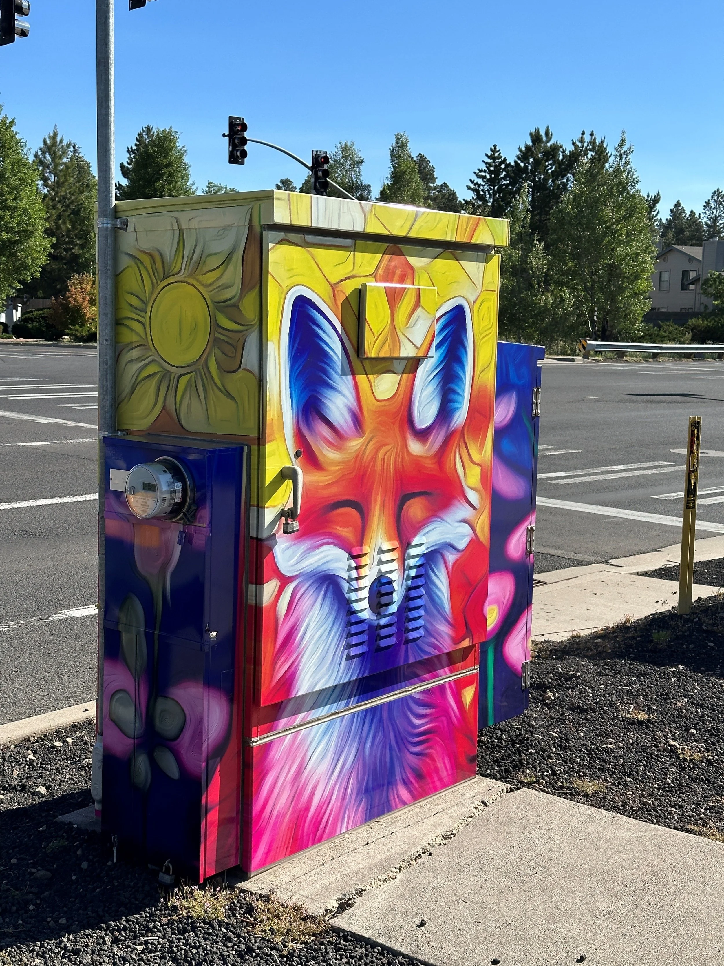 As an animal lover, local artist Joel Geist was compelled to link the site of this cabinet with the multi-use area’s namesake by presenting a vibrant, colorful fox amid a backdrop of floral designs, welcoming guests to Foxglenn Park.